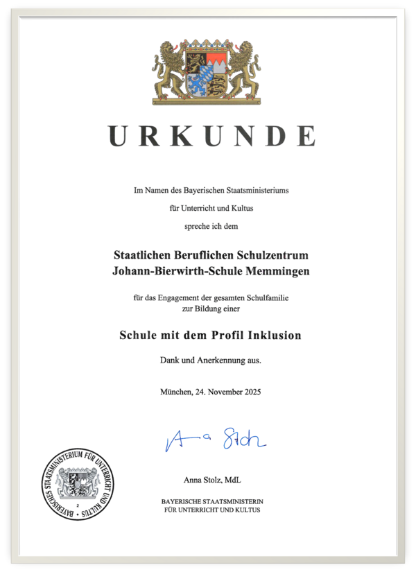 Im Rahmen eines feierlichen Festakts am 24. November 2025 im Kultusministerium überreichte Kultusministerin Anna Stolz die Urkunden für das ‚Schulprofil Inklusion‘ an die JBS Memmingen.